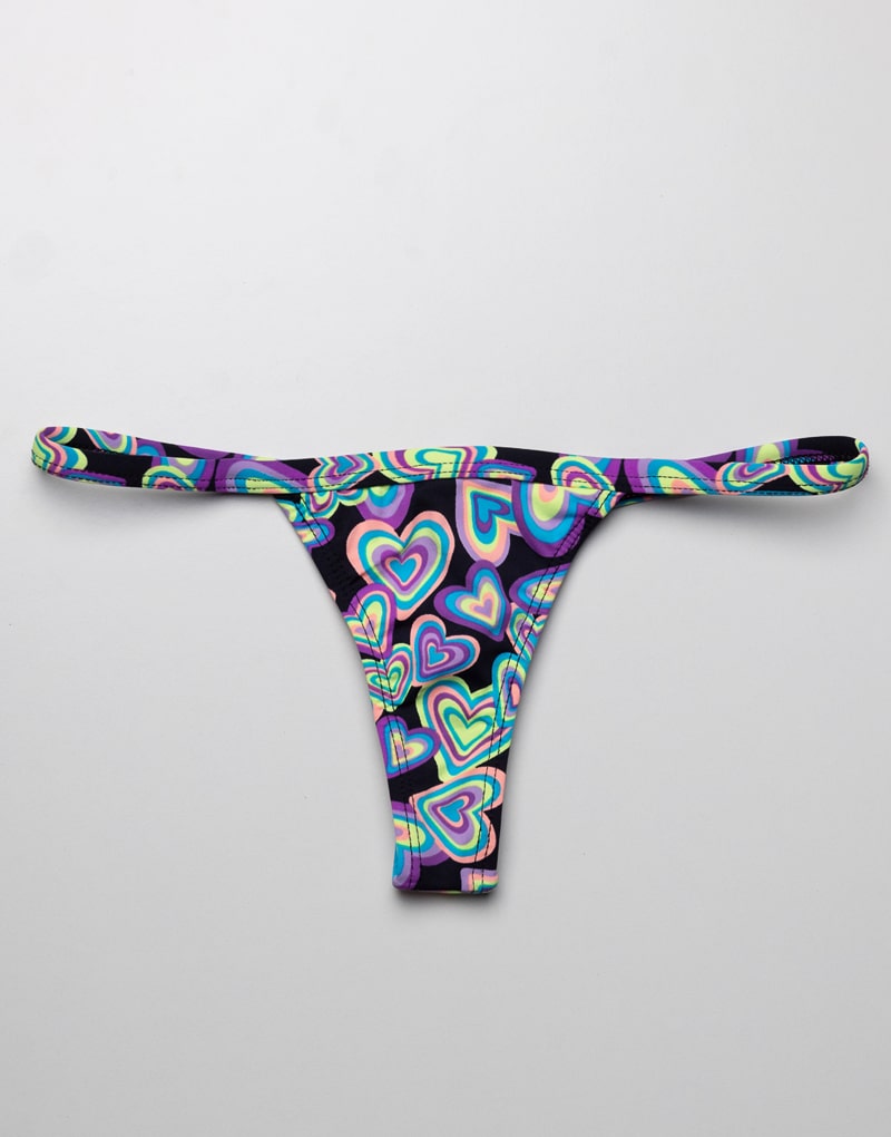 Mini tanga con tiras laterales finas y estampado de corazones neón.
